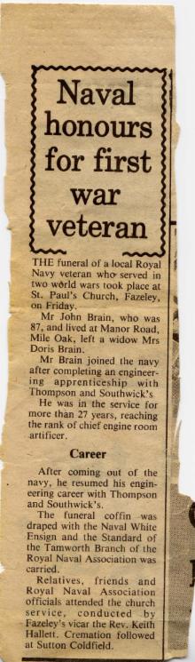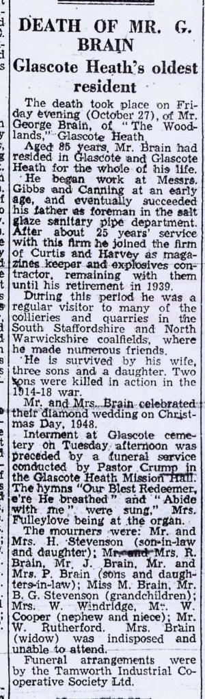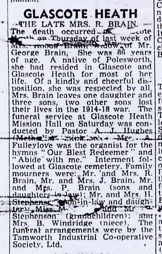 Reg was a very good crown green bowler and was a member of the Tamworth Castle Bowling Club - as were most of the family. Here you will find some newspaper cuttings about Reg and some group postcards. Jessie Brain died in the summer of 1981 aged 87.